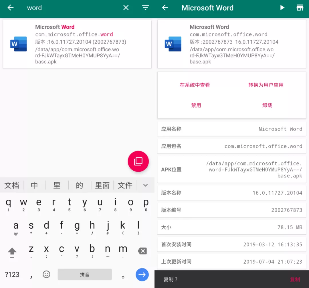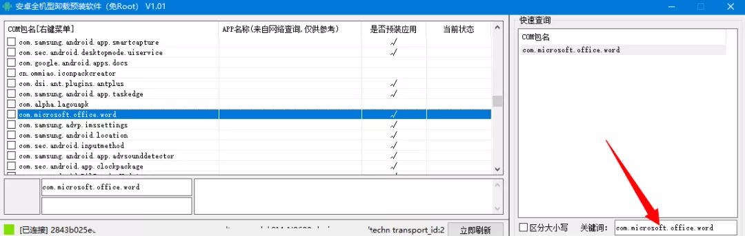 如果你打算批量卸载应用,那么复制应用包名到软件右侧搜索区域,有助于快速定位要卸载的应用。