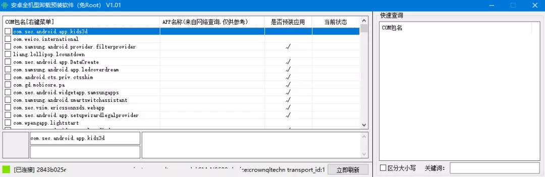 软件分左右两个功能区,左边显示了手机中全部应用的包名(App 识别标识),右边则是包名搜索区域。