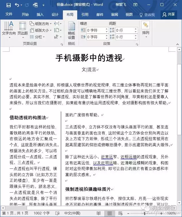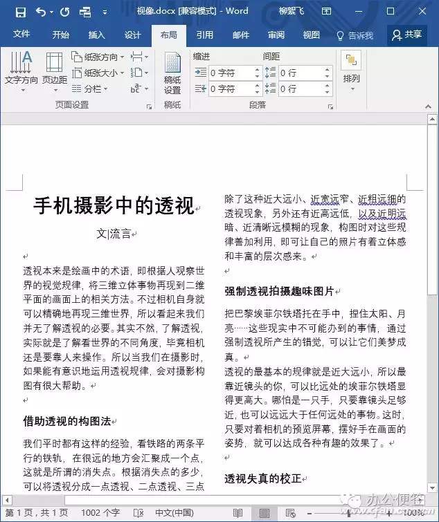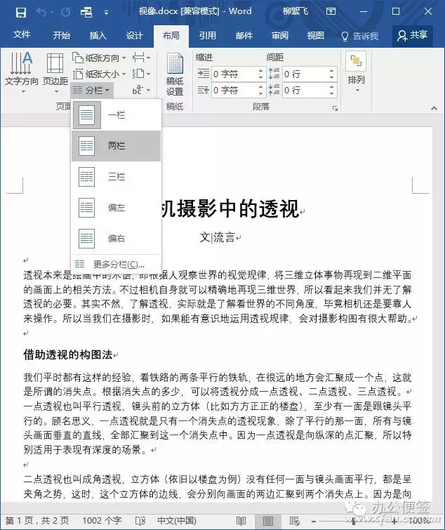 从下拉菜单中选择“两栏”后,可以看到整个文档已经自动分栏了,版面美观了很多。而且在本例中,本来显示为共2页,现在版面压缩成了1页。