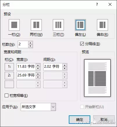 除了两栏外,我们还可以选择三栏、偏左、偏右等选项。点击分栏下拉菜单中的“更多分栏”,在打开的分栏对话框中,我们还可以对分栏进行更精细的调整。在这里,可以设置栏间距的大小,可以设置左右分栏的各自大小,勾选“分隔线”还可以添加栏间线。