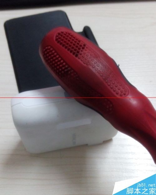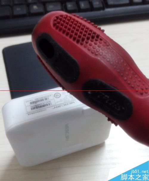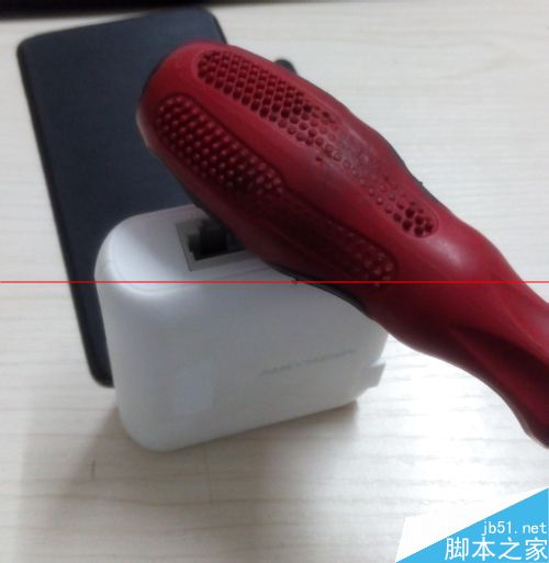 1、把迷你路由器竖立放好,用大号螺丝刀的橡胶柄敲击路由器,力量要适度。